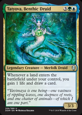 Finally! A Simic creature that doesn't want you to play more creatures. Instead it wants you to play more lands, and I'm all about that. Tatyova, Benthic Druid says, "whenever a land enters the battlefield . . . " This is important because it doesn't say, "when you play a land." So, things like Evolving Wilds and Field of Ruin will draw you two cards. Blinking a land will draw you a card. Hour of Promise will get you any two lands, make two zombies, draw you two cards, and you'll gain two life. That's a ton of value. The drawback of course is that she not only costs 5 mana and is a legend, but she has 3 toughness. That means she will die to Abrade, Lightning Strike, and Harnessed Lightning. Your sorcery speed 5-drop will die to an instant speed two cost removal spell. That really blows, I wish she was a 2/4 instead. Even though she's a 3/3, I'm still excited to try her out. Tatyova will be coming down only when I can play an Evolving Wilds right after she enters the battlefield.