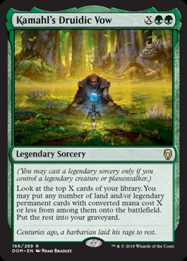 Legendary sorceries are awesome. I'm a Green mage at heart. I love me some ramp and Kamahl's Druidic Vow calls to me. Is there even a better X spell in Standard? You can cast it mid game to just get extra lands onto the battlefield. Then later follow it up with a game ending Kamahl's Druidic Vow. Let's hit Tatyova, Benthic Druid and some lands then draw all the cards and gain all the life. That's basically a Green Sphinx's Revelation.