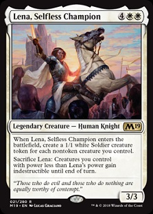 2 -- A different Captain of the Watch. Unlike Captain of the Watch, Lena asks that you have some other creatures laying around. She's also bad to play after a board wipe. She can also be killed with her trigger on the stack and create no tokens. That's not good for a 6-drop. Too mana intensive and not enough impact for my taste. |