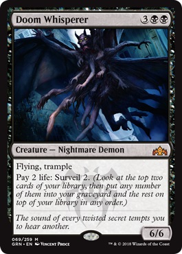 Of course, we save the best for last. Doom Whisperer is an amazing finisher for Black midrange and control decks alike. Unlike Desecration Demon and Abyssal Persecutor, Doom Whisperer has no drawback for having these insane stats. He just costs one more, but you also get a powerful ability for that extra mana you spend. Being able to pay two life and Surveil 2 whenever you want is something we haven't seen before. It is stronger than scrying since you can abuse the cards you Surveil away. For example, something like revealing two Narcomoebas to your Surveil ability. Fueling Search for Azcanta is another real prospect. So is putting cards with Jump-Start into your graveyard. If you have ways to reanimate your creatures, Doom Whisperer is also excellent at giving you fuel for your reanimate spells.