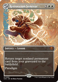 What about big Artifacts and Enchantments, though? Imagine pulling a Darksteel Forge out of your graveyard or a Primeval Bounty. Heck, I remember back during Mirrodin Standard when an opponent would use Bringer of the White Dawn to repeatedly buy back Mindslaver turn after turn to beat me. You can do just that with Restoration Seminar as well, should you feel so inclined to do so.