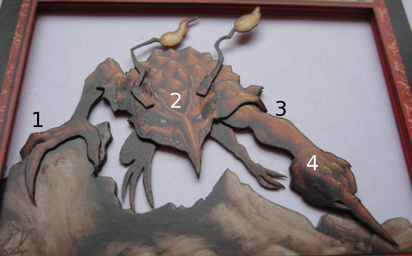 While doing this, I also decide to cut the dragon’s body and neck away from the borders of the card, leaving him attached only where his body disappears behind the rocks. This makes it possible to bend his body forward, making it look like he is forward toward the viewer.