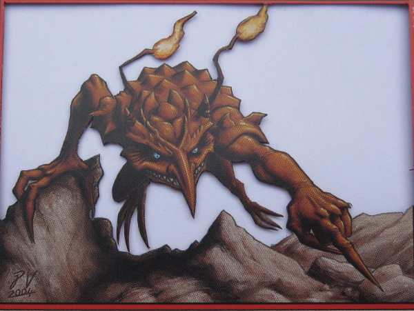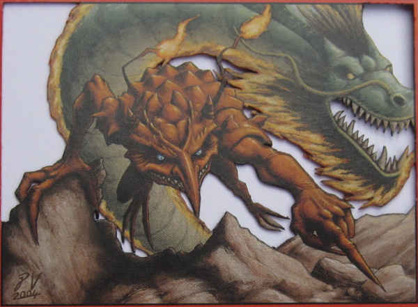 At this point, all of the layers and details are cut and ready to be fully assembled. However, the fire strands tied to Kiki-Jiki’s head are both very skinny and far from the dragon’s neck (the next layer where they exist). When an object is both skinny and far from the next layer where it exists, it is more distracting in the background. For example, look at this Deadshot Minotaur, the second 3D Magic card I ever made:
