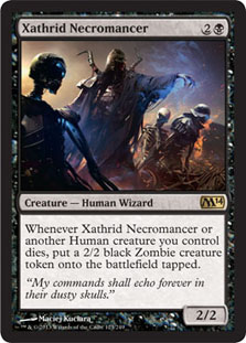 Xathrid Necromancer, a new M14 card, and Rotlung Reanimator, an old Onslaught combo enabler, are virtually identical. The Necromancer likes Humans better while the Reanimator likes Clerics. Other than that, the Necromancer requires that the Humans be creatures you control, and it summons them tapped, as they crawl out from their own graves, but those aren’t huge differences for our purposes—we just won’t be able to use Ogre Battledriver to immediately attack with all the new Zombies we’ll be making.