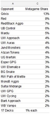 While I was deep in the trenches during the release week of format, I haven't played a Standard league since SCG Dallas, so I'm not as on top of the Magic Online metagame as I normally would be. Fortunately, Jaberwocki recorded a list of his last 100 matchups over the past week, so we still have a lot of data to work with. I'm also way too lazy to bother recording results while playing, so having this to use as a reference is more valuable anyway.