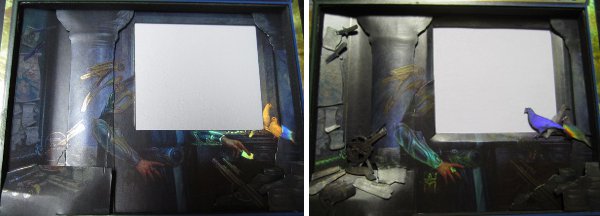 In the picture on the right, you can see that I also bent back the window ledge and added the carrier pigeons. I actually cut the pigeons while working on Zone 3.
