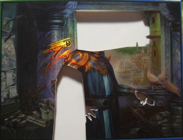 A factor I had to consider in planning this card was how the larger size would affect my process. At first, I thought that the larger art meant that the difficulty of cutting foils might be mitigated because the pieces I would be cutting would be slightly larger. When I compared the oversized card to a normal card, I realized that the larger size also meant that there were more details that it was possible to highlight.