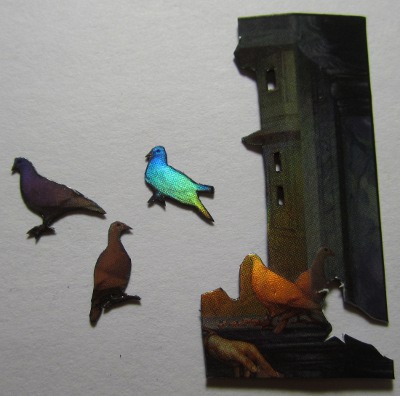 I eventually decided to make the lower part of the city lean back by cutting it loose from the top and sides and to use a detail piece to raise the nearby building. This was also the point at which I cut the pigeons from the abandoned scraps of other layers.