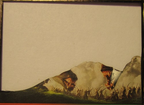 Instead of leaving it flat like that, I cut it away from the frame on the left side, and then curved it back away from the viewer. Then, I cut out two layers to make up the group of soldiers who are about to be torn apart by the beast.