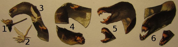 - This head tucks behind the tower from the other side. For Pieces 5 and 6, I cut out the mouths to set them back.