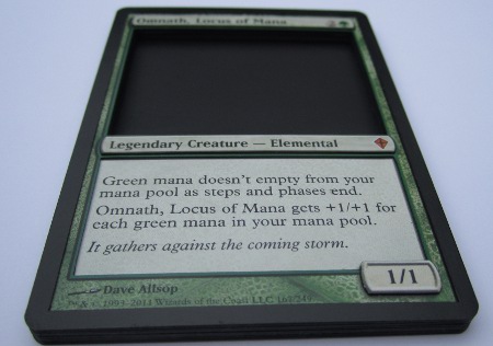On the other hand, if you're making a card for the self-described “Biggest Melvin in the world,” the art doesn't matter! You can just black out the art and make a 3D empty frame like I did on this Omnath, Locus of Mana: