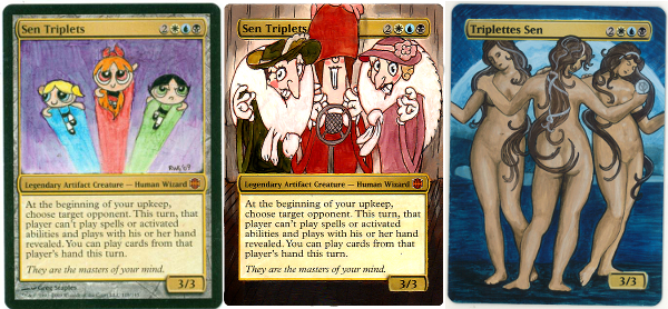 The Sen Triplets aren't the only trio of legendary ladies I plan on turning into a 3D card—the Sisters of Stone Death will be coming soon. Trostani, Selesnya's Voice and the Vendilion Clique are other trios that would also be fun to 3D, but they're a bit expensive for me to afford to destroy!