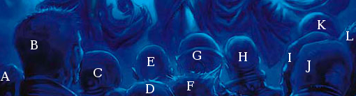 In each of those two clusters of heads, Head 1 partially overlaps Head 2, which overlaps 3, and so on. This meant that at a minimum, I would need four separate layers of heads. Next, I had to figure out what heads needed to be cut and which of them would be part of basic layers, still attached to the border of a card, and which would be free-floating detail pieces.