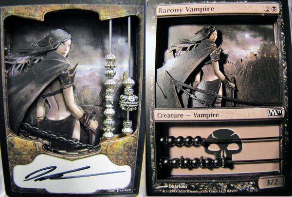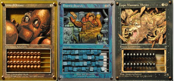 Claudio: I can get creative with as few as three cards, but I would rather use at least ten. The 3D alters I make usually end up with at least ten layers for a normal card and twenty layers if it's an abacus life counter.