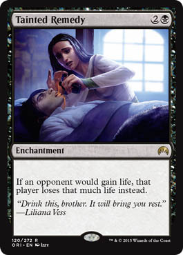 Tainted Remedy lets us play with similar concepts in a different way. Notably, having a second Remedy is useless since its ability creates a replacement effect. However, it’s permanent, and that’s a big deal. This lets us drop the enchantment early with no pressure to win immediately and then just play a long game.