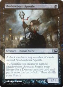 Conspiracy – The big question for this card will be whether we want to choose Cleric or Demon. Either way, the Apostles will work with Mikaeus, the Unhallowed, as the not-Xenograft text overwrites all existing creature types (just don’t choose Human!). Notably, if we choose Cleric, our Shadowborn Apostles will stop being Humans and will only be Clerics. If we choose Demon, they’ll all just be Demons. Cleric is a great choice because it allows all of our creatures to tap for Ancestor's Prophet, but additionally, Rotlung Reanimator becomes infinite with Vish Kal and any sacrifice fodder: Sacrifice the fodder to the Vampire commander, and since the fodder was a Cleric, Rotlung gives us a Zombie—no, wait; it’s a Cleric, too. Infinite! On the other hand, if we choose Demon, our Shadowborn Apostles can fetch any creature from our library . . . such as Rotlung Reanimator. Oh, what cruel irony!