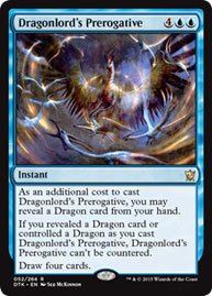 ![]() | Prerogative: Huh, we’re seeing a lot of blue cards today. Anyway, prerogative is a real word that means “a right or privilege exclusive to a particular individual or class.” In this case, we see the rights of a dragonlord illustrated by the one and only Seb McKinnon. Want to be able to cast this spell in all its might? Better take it up with Ojutai (or another dragon) first. | ![]() |
