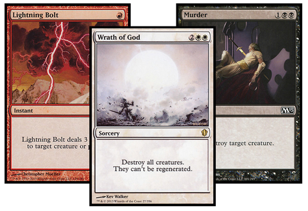 The majority of people read cards top to bottom when they see them. When you read a card like Wrath of God, you start with the name, look at the incredible Kev Walker (in this case) art, move down to the text box, and see: