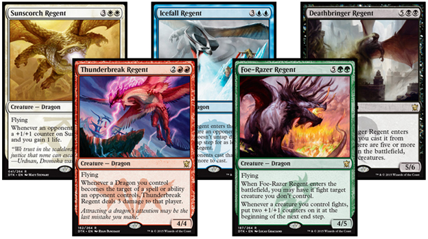 Where Tarkir differentiates itself is in that the dragon takes the place of the iconic creature in all five colors.