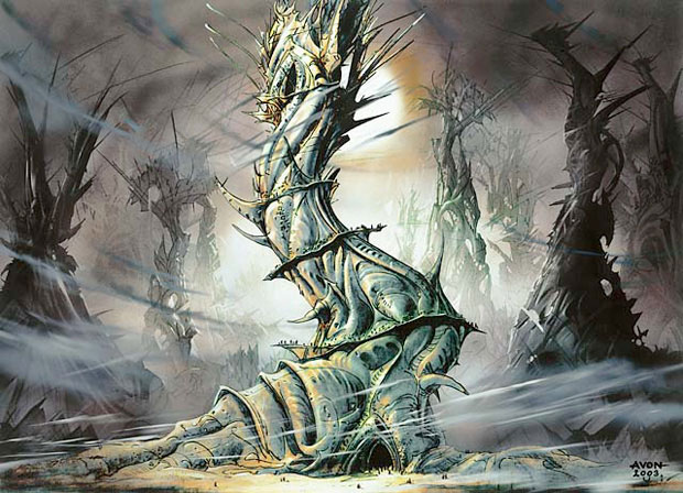 When we first went to Mirrodin, we learned of Tel-Jilad, the Tree of Tales. Home to the trolls, Tel-Jilad is the largest tree in the Tangle. Its surface is inscribed with the history of Mirrodin and is considered sacred. The original Mirrodin story ended with (spoilers!) the dawning of Mirrodin’s green-mana “sun.” When we returned to Mirrodin years later, we met Thrun and learned that he was the last remaining troll. Thrun is showcased as a walking historical archive, with the history of his plane etched into his skin not unlike his ancestral tree-home.