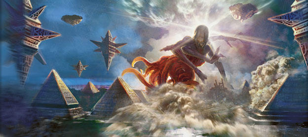 This quote ignited the dreamer within me and had me imagining the different interpretations of “first true dawn.” The word dawn has many different meanings, with its most literal being a reference to the fact that with the birth of Mirrodin’s fifth sun, a true dawn was possible with a sun of each color rising over the Glimmervoid. However, dawn also can mean “the beginning,” allowing the quote to be taken as a reference to the original storyline—that in raising the fifth sun, Glissa was able to vanquish Memnarch and release the plane from his tyrannical rule, allowing it to have its first true dawn—or beginning—as a free plane. We know now that Phyrexia had taken root on Mirrodin at an early stage, slowly growing within the planar core before taking over the plane in all-out war. Perhaps the quote is in reference to the fact that in the rising of the fifth sun, the green sun, Mirrodin’s last hope at defeating the Phyrexians was born. Green mana is the bane of artifice everywhere, so maybe the rising of the green-mana sun is seen as the beginning—or the dawning of the Mirrans’ last shred of hope.
