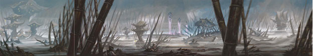 Originally printed in Champions of Kamigawa, this beautifully written line of flavor is taken out of the journal of an individual we are led to believe experienced an otherworldly journey. Kamigawa block’s story revolved around a war waged between the mortal realm and the spirit realm. As we found out on Scourge of Numai, Numai wan once a proud human city. Now only ruins remain among a swamp of rotting bamboo.