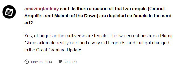 What do all of you think? Should Magic stop following its current trends of female angels and male demons? Or should they keep their current course and use the gender gap as an easy visual cue to separate the embodiments of righteousness from the demonic fiends?