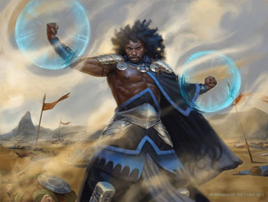 I cannot express my love of this image enough. Mike gave some really interesting behind-the-scenes insight into the image on our podcast Snack Time with Mike and Ant. There is so much cool flavor going on here: the wispy, tentacle-like nature of his cape’s interior, the interesting view of Vryn in the background lacking any mage-rings, and the force-field boxing mitts that are most likely the source of his “bounce” magic—and the hair. But my absolute favorite part of this entire piece is the look on his face.