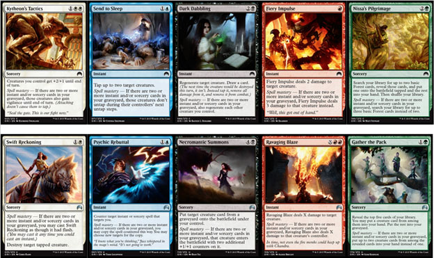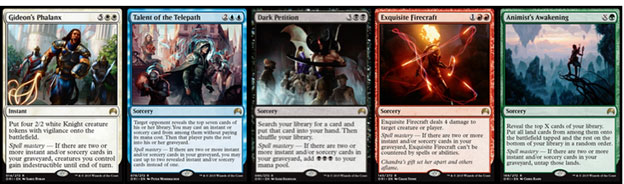 There are five vertical spell mastery cycles (one for each Planeswalker) that depicts the Planeswalker before his or her spark ignited (common), afterward (uncommon), and at or near his or her most recent power levels. These fifteen cards tell the stories of each character and serve as windows into their lives as they have developed over the set. You can actually see the progression take place from card to card, with each Planeswalker honing his or her abilities as he or she becomes stronger. These cards are just one example of Magic’s dedication to story, and they have me excited to see what the creative team has in store for us in the sets to come.