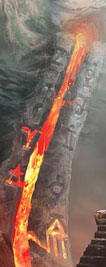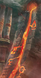 If you look closely at the art, the magma shown pouring forth from the mountain is flowing down predefined channels that branch off into different symbols. As the magma makes its way down the channel, it spills out into some of these symbols and spells out a message, serving as a form of prophecy or information for the oracle. For those Theros fans out there, this piece offers interesting insight into the written language (possibly individual letters) employed by Theros’s literate inhabitants.