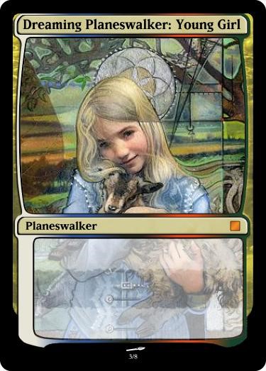 Our young Planeswalker is a talented mage born with powerful magical abilities. In order to protect their child from falling into the wrong hands, her parents hid her powers. Word somehow reached the government of this girl’s potential, and agents were sent to take her in order to study her powers and how they could be used against the enemies of her nation. When the soldiers arrived to take the girl away from her parents, she inadvertently released a large burst of power, destroying soldiers and decimating her home (and her parents). Mortified, the girl looked at the destruction she caused and fell to the ground as her pain ignited her spark. The first planeswalk did not complete, and the girl found herself drifting through the Blind Eternities. Horrified, she reverted into her own mind, inducing a coma-like sleep on herself, and she began recreating her home world within her dreams. Her new home is a dreamlike mirror of what her real home used to be, populated by beings inspired from her favorite fairytales told to her by her mother.