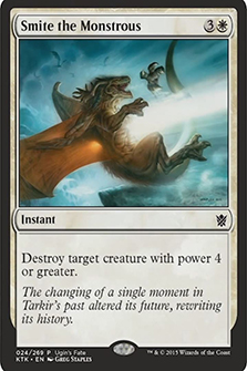 For the Temur, we can look to the card Smite the Monstrous, both as it appears in Khans of Tarkir and its alternate-art promo: