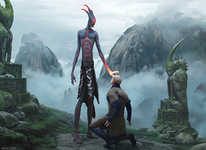As of yet, we have not seen much that would point us in the direction of what the Jeskai dragons may look like, but some have speculated that a relic of the dragons’ past can be seen in Chase Stone’s art for Bloodfire Mentor: