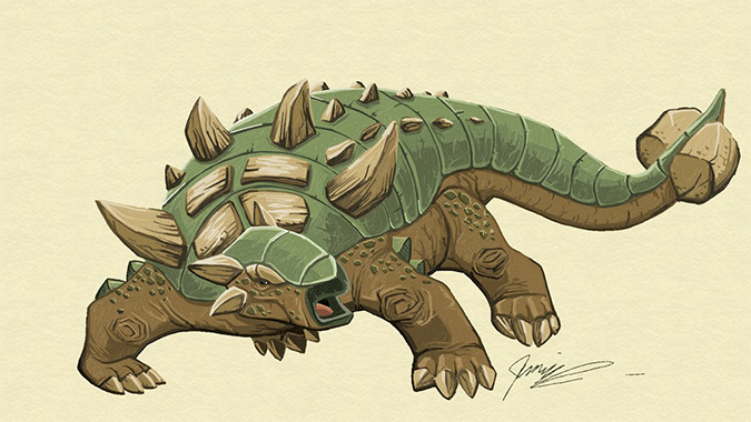 Looking at the art, we can clearly see a dragon. This particular dragon has thick, diamond-shaped scales and an extremely dense-looking skull. In many ways, this dragon looks very similar to the armored dinosaur Ankylosaurus.