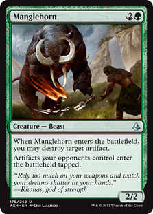 We needed a Viridian Shaman in this format, and Manglehorn is coming to the rescue. Not only does this bad beast stop an opposing Saheeli Rai combo dead in its tracks (as the tokens are all artifacts, and thus would enter tapped under a Manglehorn), but it also ekes out value against Vehicles decks, and can be blinked or copied for value from your own Felidar Guardian or Saheeli Rai. If Wizards of the Coast doesn’t ban a piece of the CopyCat combo, expect well-tuned versions of the deck to pack at least a few neo-Viridian Shamans in the 75 somewhere. Killing a Clue and forcing opposing Hearts of Kiran to enter the battlefield off-duty is a lot to get out of a three-mana 2/2 (and the body is blinkable and copiable, so it’s better than Release the Gremlins), so I’m ready for Manglehorn to come through and start breaking some fragile artifacts while the targets are juicy!
