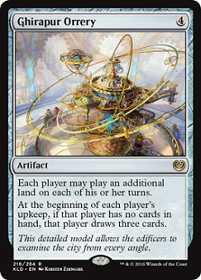 Elegant and beautiful! Here is a four-pack of four-cost artifacts that each do basically nothing on their own, but if you build around them, you can do absurd things. If this is Wizards’ new overture to creative Johnny-Spike brewing, then consider me a huge fan. I think that the most breakable is the Orrery, because there are a lot of Madness outlets and payoffs that will allow you to play a normal, synergistic deck. When you get to draw three extra cards and play an extra land every turn, things just might get a little crazy. U/R Fevered Visions/Madness, anyone?