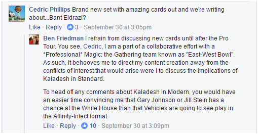 That lovely repartee you see above was me expressing my initially skeptical views of Kaladesh’s potential impact in Modern (while daggering friend and teammate Cedric Phillips, of course). As with every set release, I am generally extremely conservative on the impact new cards will have on older formats, unless something is obviously pushed by Wizards R&D. As the power level of a format goes up, you see, cards have higher and higher bars to pass in order to justify their place in decklists. Even a card as obviously powerful as Chandra, Torch of Defiance has a hard time passing the bar in a format where many decks aim to kill you by turn four. As the removal gets cheaper and more plentiful, too, cards that warp Standard (Smuggler's Copter, anyone?) end up getting relegated to the sidelines. Can you imagine, for example, the tempo swing that you incur when you Crew your Smuggler's Copter and get it Lightning Bolted? I imagine your opponent would look something like this: