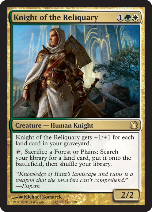 So, like Stoneforge Mystic before it, Knight of the Reliquary has virtually unlimited potential, bound only by the lands Wizards of the Coast is willing to print. It may not see much play today, but it really only takes one special land to put Knight of the Reliquary on Modern steroids and catapult it back into the spotlight. It doesn’t even need to be big in that scenario . . . it just needs to be a tutoring machine.