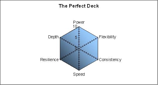 Thanks to Anthony Alongi’s animals, the multiplayer world has plenty of terms for evaluating cards, but it has few terms for evaluating decks. Since I write so often about deck-building, for which you can’t say, “Eight rattlesnakes plus four gorillas plus five planktons,” and make a deck, I worked on the problem last June and wrote about it the one time to positive response. This is my streamlined, refined version of the Decktagon—a visualization of what your deck’s good at, aided by headings from Orbital’s self-titled Brown Album for reasons known only to myself . . . at most.