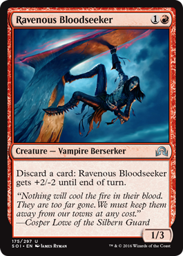 With only Incorrigible Youths and Fiery Temper shown for madness at the time I made this deck, the incentives for madness are as yet unknown. Until more are revealed, the safer plan seems to be using the discard outlets as ways to fill the graveyard and either fuel delirium or bring back important creatures as the game goes long. Heir of Falkenrath, Ravenous Bloodseeker, and Lightning Axe are the primary discard outlets, with support from Tormenting Voice, Macabre Waltz, Liliana, Defiant Necromancer, and Avaricious Dragon. Depending on how the format shakes out, Sinister Concoction might be better than Lightning Axe, or a mix might be appropriate.