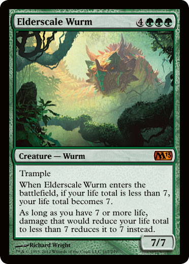 - A life-gain creature – Well, kinda. It will gain you life to 7 if your life total is below 7. Pelakka Wurm gains you 7 life regardless of your life total, which is more generally applicable, but Elderscale Wurm’s ability keeps company with Form of the Dragon in terms of weird things you can do with it. And in that realm, 7’s a lot easier to abuse than 5.