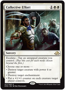 - You, turn three: Escalate Collective Effort, destroying Lambholt Butcher and Oath of Nissa and pumping your team