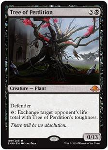 So when Tree of Perdition was spoiled, I was all kinds of excited. One of my favorite cards coming back but with a sinister twist? Uh...yes please! But Tree of Perdition alters opponents' life totals, not your own, so it plays very differently. You don't want it in the same situations, and a 0/13 defender that saves your life is more obvious synergy than an 0/13 defender that hurts an opponent.