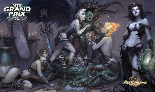 Now, let’s take a step back. This was the play mat image for GP: Indianapolis, which was organized and planned by a third-party organization: Pastimes. Wizards had no hand in the creation or generation of the product (beyond any possible vague suggestions of: “A play mat is a great incentive to attract more players to your event.”). But is that enough? Are we okay with saying, “Wizards didn’t create it, so it’s not associated with the game?”