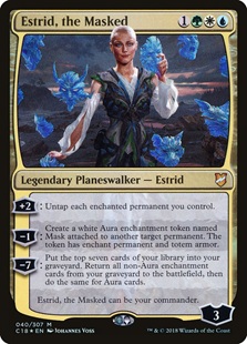 ) Planeswalker that likes enchantments. Her abilities are quite strong. She lets you untap your enchanted permanents and put auras on your permanents that protect them from being destroyed. Her ultimate returns all enchantments from your graveyard to the battlefield. Estrid is an excellent pick for either an Enchantress deck or an Aura deck. She gets extra points for being one of the few Commanders for these types of decks that gives you access to Blue mana.