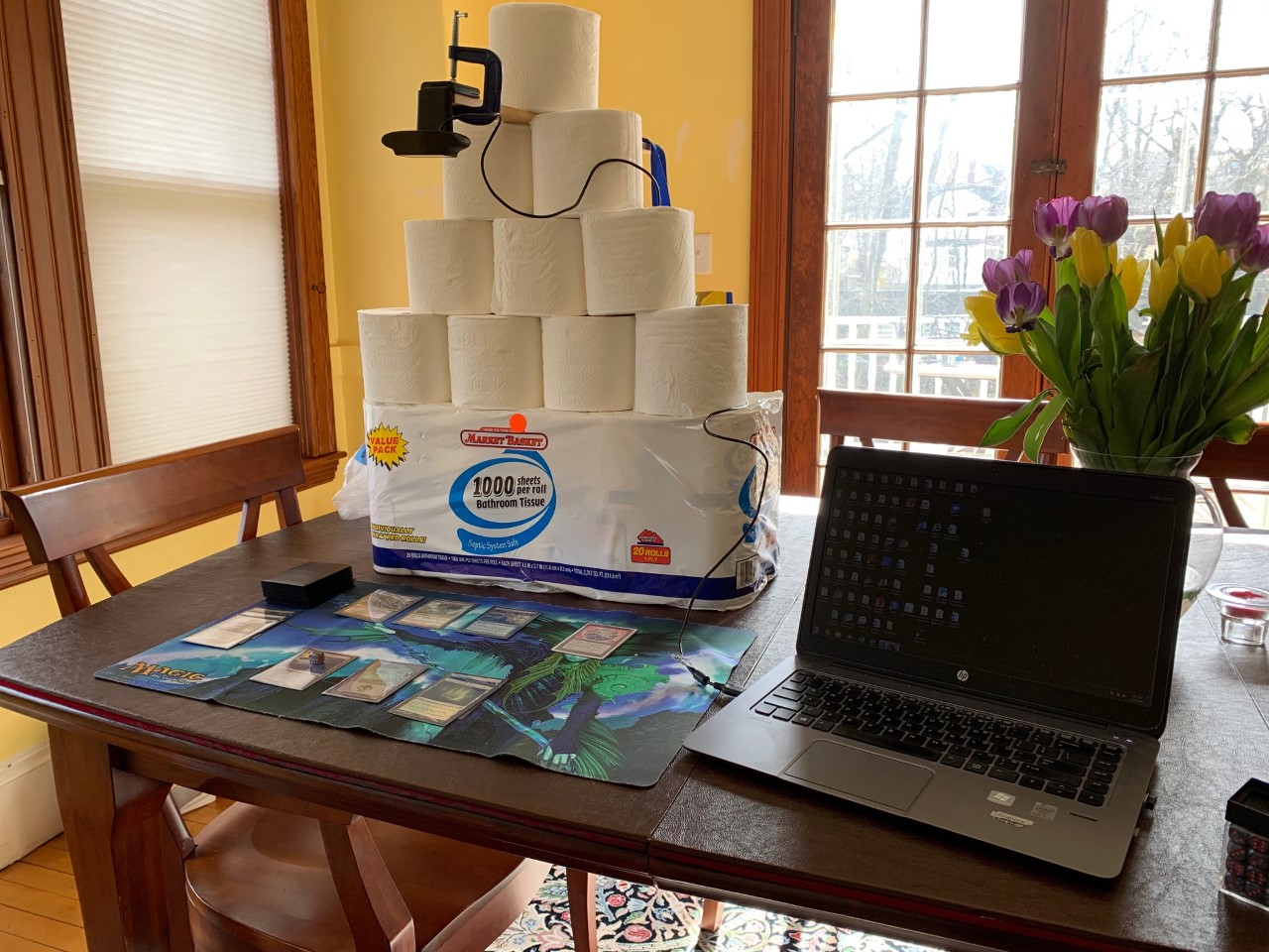 This can take a little bit of work, but is well worth the effort. The key is to make sure the camera is set at the appropriate height to allow your friend to see your entire playmat. This can be a little tricky, but I've found that my stockpiled toilet paper makes a great makeshift tripod.