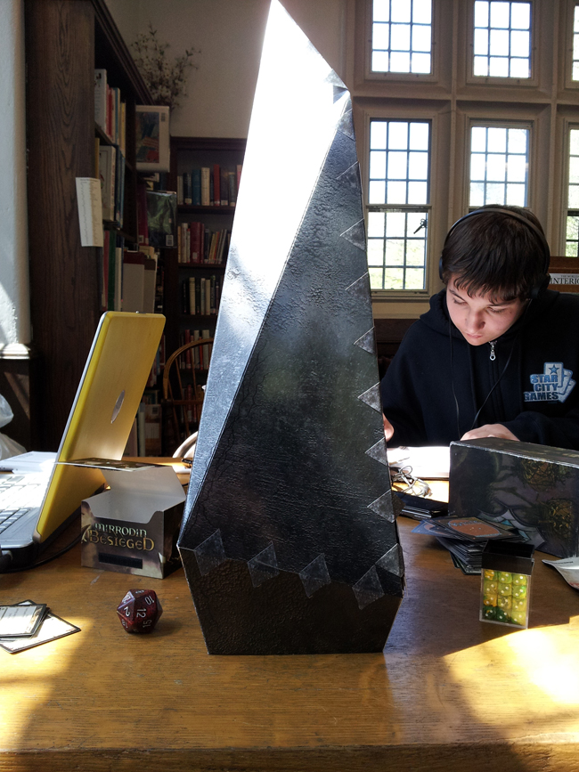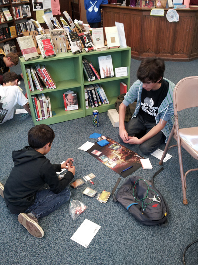 This was our oldest player (Conrad) playing our youngest player (Spencer). I am reminded of how old I am, since there is no way that I could sit on the floor to play an entire game of Magic, and I certainly couldn’t do it in the position Spencer is in! I faintly recall having bones made of rubber when I was young . . .