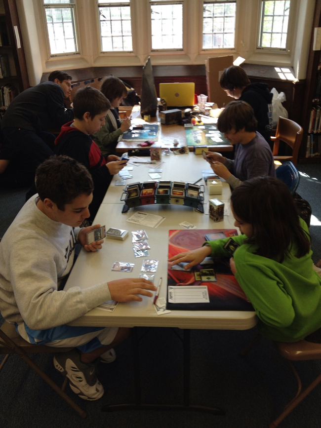 These are the players who prefer the tables. While the small space limits the attendance, it keeps the tournament intimate. I can call out the pairings as soon as the final players are finished with the previous round, and know that they heard me since I’m looking at each person as I call his or her name. Judge calls never involve walking more than a few feet, and theft is practically non-existent. The kids regularly leave their cards piled on a table or bookshelf for the entire tournament, coming back to the cards only at the end of the tournament when they are gathering up their things.