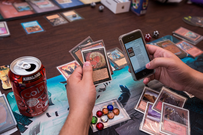 Our games were wild back-and-forth displays. I got in for some early damage, and then Jesse stabilized with little creatures and managed to take control and start whittling my life total. I put out Sol’kanar and managed to swing once before he played out the Horn of Deafening, making my Sol’kanar do very little other than tap a few of Jesse’s lands. In an earlier game, Jesse had pulled out his iPhone and was looking at something . . .