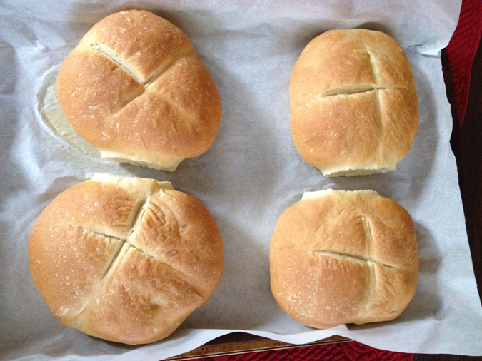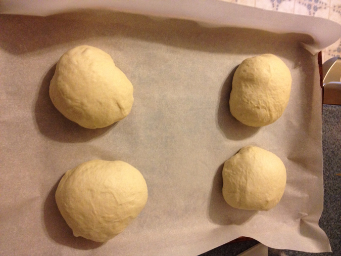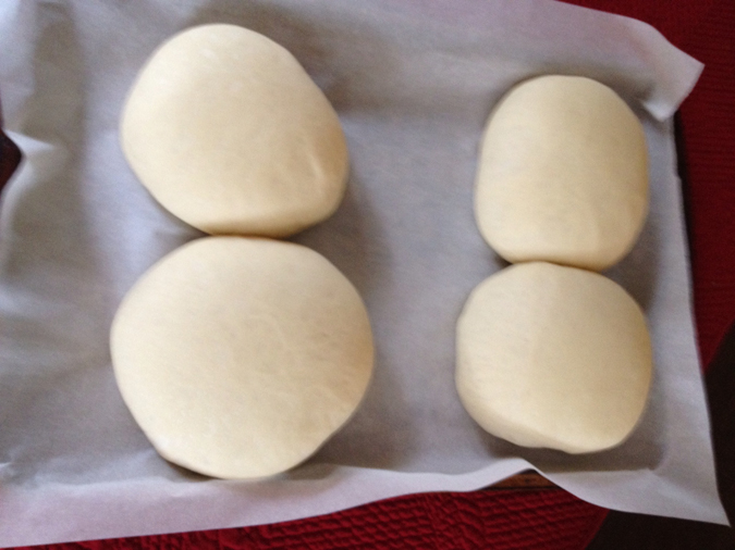Mix the ingredients together and knead for eight minutes (or have a KitchenAid mixer do that for you!). Form the dough into a large ball, cover and let sit in a dry, warm place for about an hour or until it doubles in size. Punch it down and form into 4 evenly sized balls (about half a pound). For those of you with bread machine, set it to make just the dough for a loaf of bread. When it is finished, take out your dough, punch it down, and form it into 4 evenly sized balls. Just like the ones below: